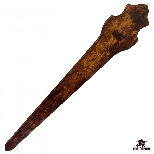 Our Sword Display Plaques are the perfect way to display your replica or antique swords. They are hand made in Italy and are crafted from wood with a varnished finish. This plaque is held in place by 2 small pins and can be easily removed if necessary. The blade is secured in place with a fixed leather strap at the top mount and a brass socket at the bottom.