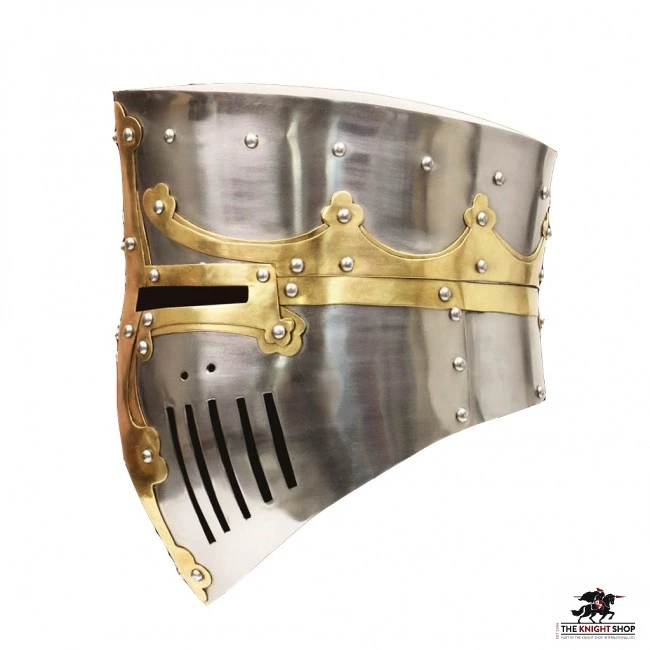 Made of 18 gauge steel, this lavish helm is adorned in decorative brass and comes with a soft cloth padded adjustable liner with leather tie straps.