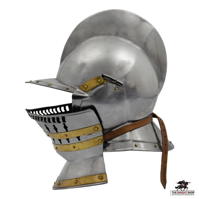 The Tudor Burgonet is handcrafted from polished steel and has hinged cheek pieces, a detachable visor (falling buffe – held in place with a buckled leather strap) and brass decoration. Comes complete with separate padded lining cap that can be glued in if required. Â It is constructed from 18 gauge steel and is great for theatrical use or display.