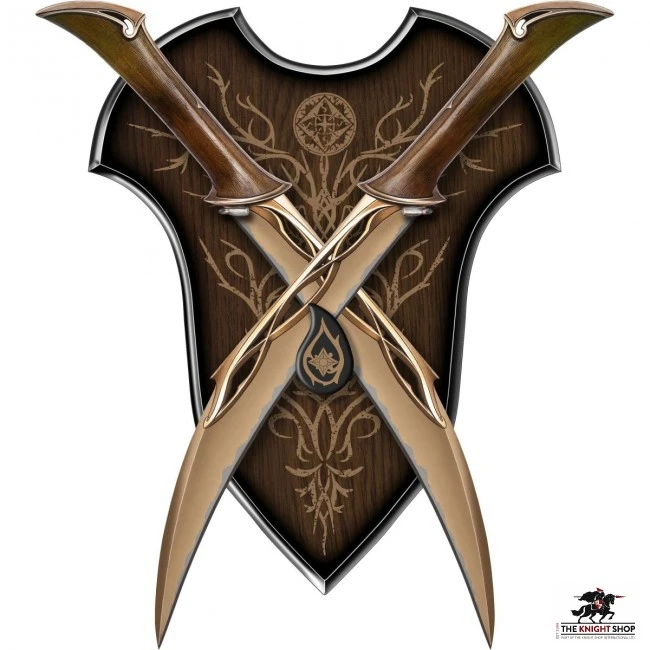 As Captain of the Woodland Guard, Tauriel carries signature twin daggers with blades forged of a bronzed alloy and a Silvan steel edge of superior strength. The hilts are crafted from greenwood with bronzed steel fittings. This replica is crafted of stainless steel with cast metal and polycarbonate handles, precisely detailed and colored to exactly match the movie prop. It is presented with a wood wall mount featuring graphic motif of Tauriel, and includes a certificate of authenticity.