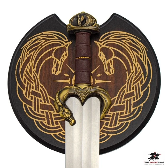 Éomer was a captain of the king’s cavalry, Marshal of the Mark, and one of Rohan’s mightiest warriors. He skillfully wielded his royal sword, Gúthwinë, and used it to slay many Orcs and Uruks of Isengard that dared trespass into Rohan. He bravely fought alongside King Theoden against the forces of Mordor at the battle of Helm’s Deep and on the Pelennor Fields. In the final stand against the dark lord Sauron, Éomer fought alongside Aragorn with the armies of Rohan and Gondor at the Gates of Mordor. This authentically detailed replica is a reproduction of the actual filming prop built by Weta Workshop and used in The Lord Of The Rings films presented by New Line Cinema. This 34” long sword was made using only the finest grade materials and craftsmanship available. It features brass-finished, cast metal hilt parts, a genuine leather-wrapped grip, and a 27” stainless steel blade with engraved fuller grooves.
