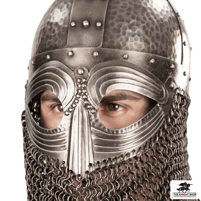 From the chaotic time of the Dark Ages comes this magnificent helmet worn by the elite mounted troops of the Slavic princedoms. The Vendel Viking Helm allows you to armor yourself like a true warrior. Vendel warriors were known for their fierceness as well as their elaborate armour, as shown in this piece. This helm is hand-made of 18 gauge steel, has a rough-hammered dome, and a highly ornate face guard. In addition, a shoulder-length, steel aventail has been added for both protection and a foreboding look. A soft adjustable cloth liner allows for a great fit and comfort.