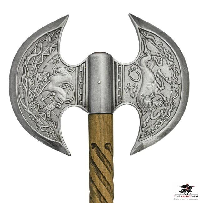 Perhaps the most common hand weapon among Vikings was the axe. This beautiful axe has a solid-wood haft, turned with a spiral pattern, while the axe-blade has a double-head and is embellished with ornately decorative designs. Simple in its form but highly decorated, this axe is the ideal collector’s piece that shows off both the axes simplistic shape, as well as beautiful eye-catching features.